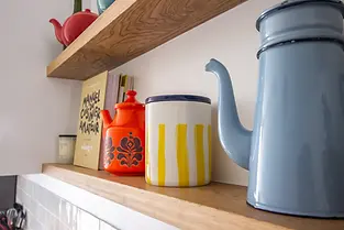 Le bois est évidemment le premier allié. C’est lui qui réchauffe le bleu et lui donne ce côté accueillant. Dans le projet d’Elsa et Jonathan, c’est clairement ce qui a créé l’équilibre ! Mais on peut aussi ajouter des petites touches de jaune moutarde, de laiton ou de cuivre pour amener un côté chic et lumineux (regardez nos poignées de porte). Et si on préfère rester plus sobre, les beiges, les blancs cassés ou même un gris clair font parfaitement le job pour adoucir l’ensemble. Les couleurs pop éveillent ce bleu et permettent d'apporter énergie et vitalité, ce sera une solution plus moderne et moins "plan plan"!